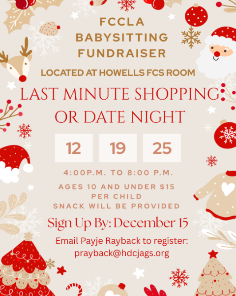 FCCLA will be hosting a babysitting service that is open to all children 10 & under on December 19th from 4 pm until 8 pm in the Howells FCS room. Parents can use this time for last-minute Christmas shopping or a date night! All money that is raised will go towards the Christmas Bags that Emma Ortmeier and Jordyn Hamata will be making for their FCCLA STAR project. There will be a snack provided for each child and educational games that they will participate in. Money will be collected on the day of drop-off. To register your child, please email Payje Rayback at prayback@hdcjags.org. Include your child's name, age, and if they have any allergies.
