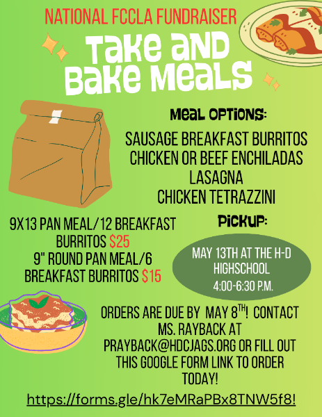 The FCCLA National qualifiers are hosting a round of take-and-bake meals! These meals would be perfect for the summertime, planting season, a new mom, or a last-minute delicious meal. Not only are you gaining efficiency in your home, but you are also helping these FCCLA members raise funds for their trip to Washington, D.C., to represent Howells-Dodge with their FCCLA STAR project. The take-and-bake meals that are available are lasagna, chicken tetrazzini, beef or chicken enchiladas, and sausage breakfast burritos. If you would like to place your order, click this link https://forms.gle/